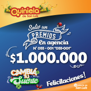 ¡Salió un premio de Quiniela en San Luis! El día Sábado 27 de Septiembre, en la Agencia N° 036-000 "Conejo de la Suerte" de San Luis, salió un premio de Quiniela de $3.000.000 ¡Felicitaciones al afortunado ganador!