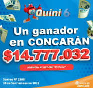 Lunes 29 de septiembre de 2025.‐ Ayer por la noche, en la ciudad de Santa Fe se realizó el concurso N° 3.308 de Quini 6, donde hubo en la modalidad “Siempre Sale”, un ganador de la provincia de San Luis quien se llevó un premio de $14.777.032,50- La apuesta ganadora se hizo en la localidad de Concarán más precisamente en la agencia ...