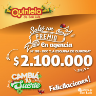 ¡Salió un premio de Quiniela en San Luis! El día Sábado 27 de Septiembre, en la Agencia N° 198-000 "La Esquina de Quiroga" de San Luis, salió un premio de Quiniela de $2.100.000 ¡Felicitaciones al afortunado ganador!