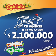 ¡Salió un premio de Quiniela en Villa Mercedes! El día Jueves 30 de Enero, en la Agencia N° 158-000 "La Taba" de Villa Mercedes, salió un premio de Quiniela de $2.100.000 ¡Felicitaciones al afortunado ganador!
