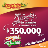 ¡Salió un premio de Quiniela en Santa Rosa de Conlara! El día Jueves 30 de Enero, en la Agencia N° 359-000 "La Tati" de Santa Rosa de Conlara, salió un premio de Quiniela de $350.000 ¡Felicitaciones al afortunado ganador!