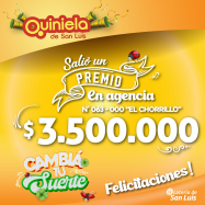 ¡Salió un premio de Quiniela en Juana Koslay! El día Viernes 31 de Enero, en la Agencia N° 063-000 "El chorrillo" de Juana Koslay, salió un premio de Quiniela de $3.500.000 ¡Felicitaciones al afortunado ganador!