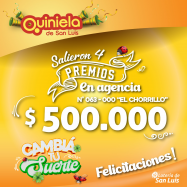 ¡Salieron cuatro premios de Quiniela en Juana Koslay! El día Viernes 31 de Enero, en la Agencia N° 063-000 "El chorrillo" de Juana Koslay, salieron cuatro premios de Quiniela de $500.000 c/u ¡Felicitaciones a los afortunados ganadores!