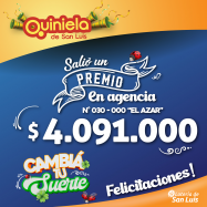 ¡Salió un premio de Quiniela en Tilisarao! El día Lunes 27 de Enero, en la Agencia N° 030-000 "El Azar" de Tilisarao, salió un premio de Quiniela de $4.091.000 ¡Felicitaciones al afortunado ganador!