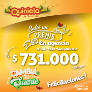 ¡Salió un premio de Quiniela en San Luis! El día Martes 28 de Enero, en la Agencia N° 514-000 "San Miguel" de San Luis, salió un premio de Quiniela de $731.000 ¡Felicitaciones al afortunado ganador!