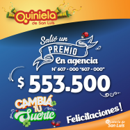 ¡Salió un premio de Quiniela en San Luis! El día Martes 28 de Enero, en la Agencia N° 607-000 de San Luis, salió un premio de Quiniela de $553.500 ¡Felicitaciones al afortunado ganador!