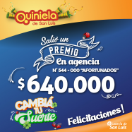 ¡Salió un premio de Quiniela en Villa Mercedes! El día Martes 28 de Enero, en la Agencia N° 544-000 "Afortunados" de Villa Mercedes, salió un premio de Quiniela de $640.000 ¡Felicitaciones al afortunado ganador!