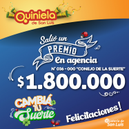 ¡Salió un premio de Quiniela en San Luis! El día Sábado 25 de Enero, en la Agencia N° 036-000 " Conejo de la Suerte" de San Luis, salió un premio de Quiniela de $1.800.000 ¡Felicitaciones al afortunado ganador!