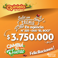 ¡Salió un premio de Quiniela en Justo Daract! El día Jueves 23 de Enero, en la Agencia N° 325-000 "El Boci" de Justo Daract, salió un premio de Quiniela de $3.750.000 ¡Felicitaciones al afortunado ganador!