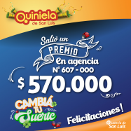 ¡Salió un premio de Quiniela en San Luis! El día Viernes 24 de Enero, en la Agencia N° 607-000 de San Luis, salió un premio de Quiniela de $570.000 ¡Felicitaciones al afortunado ganador!