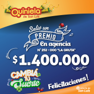 ¡Salió un premio de Quiniela en San Luis! El día Viernes 17 de Enero, en la Agencia N° 252-000  "La Gruta" de San Luis, salió un premio de Quiniela de $1.400.000 ¡Felicitaciones al afortunado ganador!