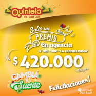 ¡Salió un premio de Quiniela en San Luis! El día Martes 21 de Enero, en la Agencia N° 015-000 "La Quinielisima" de San Luis, salió un premio de Quiniela de $420.000 ¡Felicitaciones al afortunado ganador!