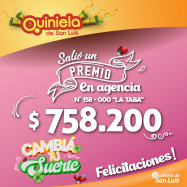 ¡Salió un premio de Quiniela en Villa Mercedes! El día Martes 21 de Enero, en la Agencia N° 158-000 "La Taba" de Villa Mercedes, salió un premio de Quiniela de $758.200 ¡Felicitaciones al afortunado ganador!