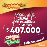 ¡Salió un premio de Quiniela en Lujan! El día Lunes 20 de Enero, en la Agencia N° 055-000 de Lujan, salió un premio de Quiniela de $407.000 ¡Felicitaciones al afortunado ganador!