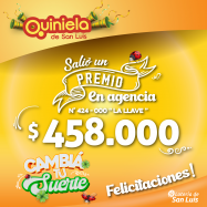 ¡Salió un premio de Quiniela en Villa Mercedes! El día Sábado 14 de Diciembre, en la Agencia N° 458-000 "La Llave" de Villa Mercedes , salió un premio de Quiniela de $458.000 ¡Felicitaciones a los afortunados ganadores!