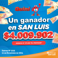 ¡El sorteo N° 3225 del Quini 6 del día 11 de Diciembre dejó un ganador en San Luis!  El afortunado apostador jugó su cupón en la Agencia N° 479-000 "El Profesor" de San Luis y se llevó un premio en la modalidad "Siempre Sale" con 5 aciertos de $4.009.902   ¡Felicitaciones al afortunado ganador!