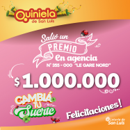 ¡Salió un premio de Quiniela en Tilisarao! El día Lunes 9 de Diciembre, en la Agencia N° 355-000 "Le Gare Nord" de Tilisarao, salió un premio de Quiniela de $1.000.000 ¡Felicitaciones a los afortunados ganadores!