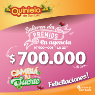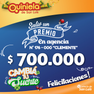 ¡Salió un premio de Quiniela en San Luis! El día Martes 10 de Diciembre, en la Agencia N° 176-000 "Clemente" de San Luis, salió un premio de Quiniela de $700.000 ¡Felicitaciones a los afortunados ganadores!