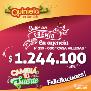 ¡Salió un premio de Quiniela en San Luis! El día Jueves 12 de Diciembre, en la Agencia N° 259-000 "Casa Villegas" de San Luis, salió un premio de Quiniela de $1.244.100 ¡Felicitaciones a los afortunados ganadores!