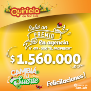 ¡Salió un premio de Quiniela en San Luis! El día Lunes 9 de Diciembre, en la Agencia N° 479-000 "El Profesor" de San Luis, salió un premio de Quiniela de $1.560.000 ¡Felicitaciones a los afortunados ganadores!