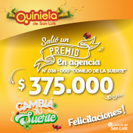 ¡Salió un premio de Quiniela en San Luis! El día Viernes 29 de Noviembre, en la Agencia N° 036-000 "Conejo de la Suerte" de San Luis, salió un premio de Quiniela de $375.000 ¡Felicitaciones al afortunado ganador!