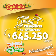 ¡Salió un premio de Quiniela en San Luis! El día Viernes 29 de Noviembre, en la Agencia N° 176-000 "Clemente" de San Luis, salió un premio de Quiniela de $645.250 ¡Felicitaciones al afortunado ganador!