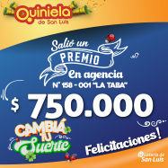 ¡Salió un premio de Quiniela en Villa Mercedes! El día Viernes 30 de Noviembre, en la Agencia N° 158-001 "La Taba" de Villa Mercedes, salió un premio de Quiniela de $750.000 ¡Felicitaciones al afortunado ganador!