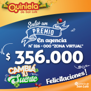 ¡Salió un premio de Quiniela en San Luis! El día Viernes 30 de Noviembre, en la Agencia N° 326-000 "Zona Virtual" de San Luis, salió un premio de Quiniela de $356.000 ¡Felicitaciones al afortunado ganador!