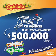 ¡Salió un premio de Quiniela en San Luis! El día Lunes 18 de Noviembre, en la Agencia N° 007-000 "La Millonaria" de San Luis, salió un premio de Quiniela de $500.000 ¡Felicitaciones al afortunado ganador!