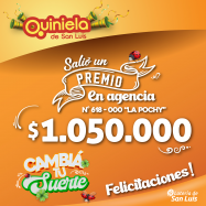 ¡Salió un premio de Quiniela en San Luis! El día Martes 19 de Noviembre, en la Agencia N° 618-000 "La Pochy" de San Luis, salió un premio de Quiniela de $1.000.000 ¡Felicitaciones al afortunado ganador!