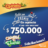 ¡Salió un premio de Quiniela en San Luis! El día Miércoles 20 de Noviembre, en la Agencia N° 062-000 "Arco Iris" de San Luis, salió un premio de Quiniela de $750.000 ¡Felicitaciones al afortunado ganador!