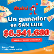¡El sorteo N° 3218 del Quini 6 del día 17 de Noviembre dejó un ganador en San Luis!  El afortunado apostador jugó su cupón en la Agencia N° 188-000 "Mi Azucena" de San Luis y se llevó un premio en la modalidad "Siempre Sale" de $6.541.680   ¡Felicitaciones al afortunado ganador!