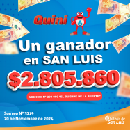 ¡El sorteo N° 3219 del Quini 6 del día 20 de Noviembre dejó un ganador en San Luis!  El afortunado apostador jugó su cupón en la Agencia N° 200-000 "El Duende de la Suerte" de San Luis y se llevó un premio en la modalidad "Siempre Sale" de $2.805.860   ¡Felicitaciones al afortunado ganador!