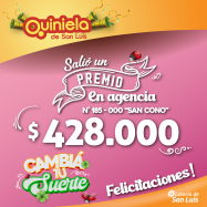 ¡Salió un premio de Quiniela en San Luis! El día Lunes 11 de Noviembre, en la Agencia N° 185-000 "San Cono" de San Luis, salió un premio de Quiniela de $428.000 ¡Felicitaciones al afortunado ganador!