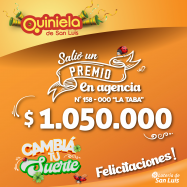 ¡Salió un premio de Quiniela en Villa Mercedes! El día Jueves 14 de Noviembre, en la Agencia N° 158-000 "La Taba" de Villa Mercedes, salió un premio de Quiniela de $1.050.000 ¡Felicitaciones al afortunado ganador!