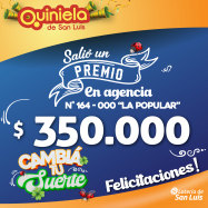 ¡Salió un premio de Quiniela en Villa Mercedes! El día Miercoles 13 de Noviembre, en la Agencia N° 164-000 "La Popular" de Villa Mercedes, salió un premio de Quiniela de $350.000 ¡Felicitaciones al afortunado ganador!