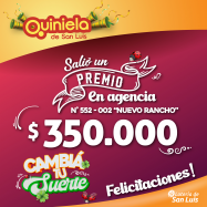 ¡Salió un premio de Quiniela en La Punta! El día Miercoles 13 de Noviembre, en la Agencia N° 252-002 "Nuevo Rancho" de La Punta, salió un premio de Quiniela de $350.000 ¡Felicitaciones al afortunado ganador!