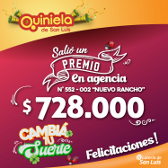 ¡Salió un premio de Quiniela en La Punta! El día Miercoles 13 de Noviembre, en la Agencia N° 252-002 "Nuevo Rancho" de La Punta, salió un premio de Quiniela de $728.000 ¡Felicitaciones al afortunado ganador!