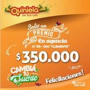 ¡Salió un premio de Quiniela en San Luis! El día Lunes 21 de Octubre, en la Agencia N° 176-000 "Clemente" de San Luis, salió un premio de Quiniela de $350.000 ¡Felicitaciones al afortunado ganador!