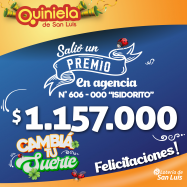 ¡Salió un premio de Quiniela en San Luis! El día Martes 22 de Octubre, en la Agencia N° 606-000 "Isidorito" de San Luis, salió un premio de Quiniela de $1.157.000 ¡Felicitaciones al afortunado ganador!