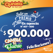 ¡Salió un premio de Quiniela en San Luis! El día Sabado 19 de Octubre, en la Agencia N° 607-000 de San Luis, salió un premio de Quiniela de $900.000 ¡Felicitaciones al afortunado ganador!
