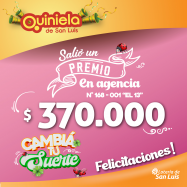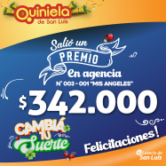 ¡Salió un premio de Quiniela en San Luis! El día Lunes 14 de Octubre, en la Agencia N° 003-001 "Mis Angeles" de San Luis, salió un premio de Quiniela de $342.000 ¡Felicitaciones al afortunado ganador!