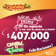 ¡Salió un premio de Quiniela en Santa Rosa! El día Lunes 14 de Octubre, en la Agencia N° 035-000 "El Genio de la Suerte" de Santa Rosa, salió un premio de Quiniela de $407.000 ¡Felicitaciones al afortunado ganador!