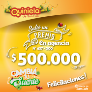 ¡Salió un premio de Quiniela en Villa Mercedes! El día Miércoles 09 de Octubre, en la Agencia N° 637-000  de Villa Mercedes, salió un premio de Quiniela de $500.000 ¡Felicitaciones al afortunado ganador!