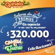 ¡Salieron dos premios de Quiniela en Villa Mercedes! El día Martes 01 de Octubre, en la Agencia N° 469-000  "El Millonario" de Villa Mercedes, salieron dos premios de Quiniela de $320.000 cada uno. ¡Felicitaciones al afortunado ganador!