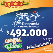 ¡Salió un premio de Quiniela en San Luis! El día Martes 01 de Octubre, en la Agencia N° 515-000  "Pipi-Cucu" de San Luis, salió un premio de Quiniela de $492.000 ¡Felicitaciones al afortunado ganador!