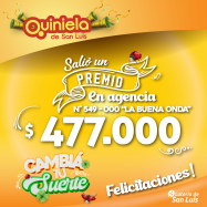 ¡Salió un premio de Quiniela en Merlo! El día Sábado 28 de Septiembre, en la Agencia N° 549-000  "La Buena Onda" de Merlo, salió un premio de Quiniela de $477.000 ¡Felicitaciones al afortunado ganador!