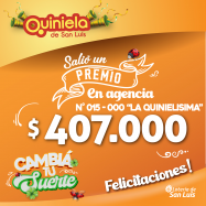 ¡Salió un premio de Quiniela en San Luis! El día Viernes 07 de Septiembre, en la Agencia N°015-000  "La Quinielisima" de San Luis, salió un premio de Quiniela de $407.000 ¡Felicitaciones al afortunado ganador!