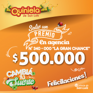 ¡Salió un premio de Quiniela en Villa Mercedes! El día Jueves 05 de Septiembre, en la Agencia N°340-000 "La Gran Chance" de Villa Mercedes, salió un premio de Quiniela de $500.000 ¡Felicitaciones al afortunado ganador!
