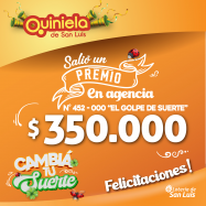 ¡Salió un premio de Quiniela en San Luis! El día Martes 03 de Septiembre, en la Agencia N° 452-000 "El Golpe de Suerte" de San Luis, salió un premio de Quiniela de $350.000 ¡Felicitaciones al afortunado ganador!